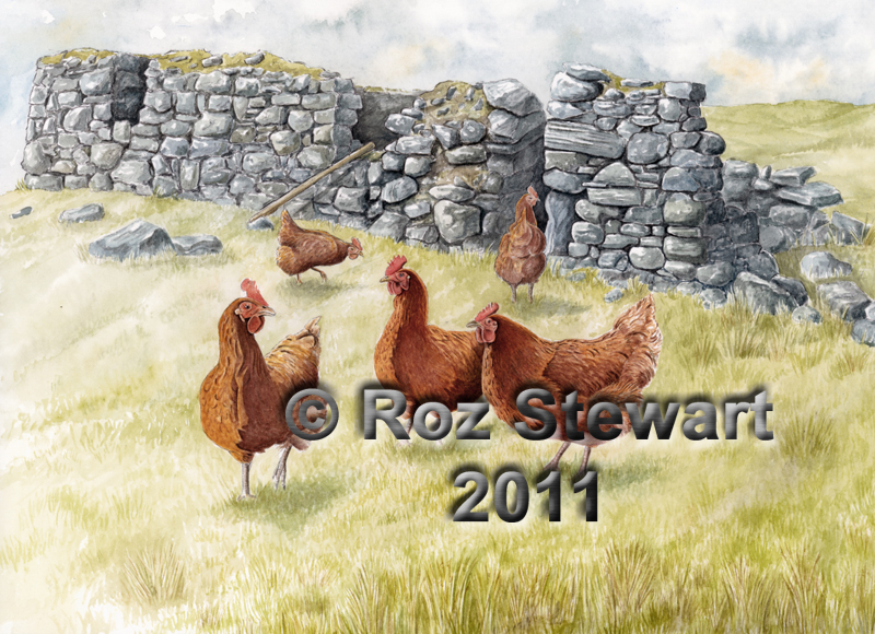 Domestic hens. Roz keeps hens, seen here in front of the ruined thatched house on her croft. The house was, until 1950, where the original tenants the Macrae family lived.